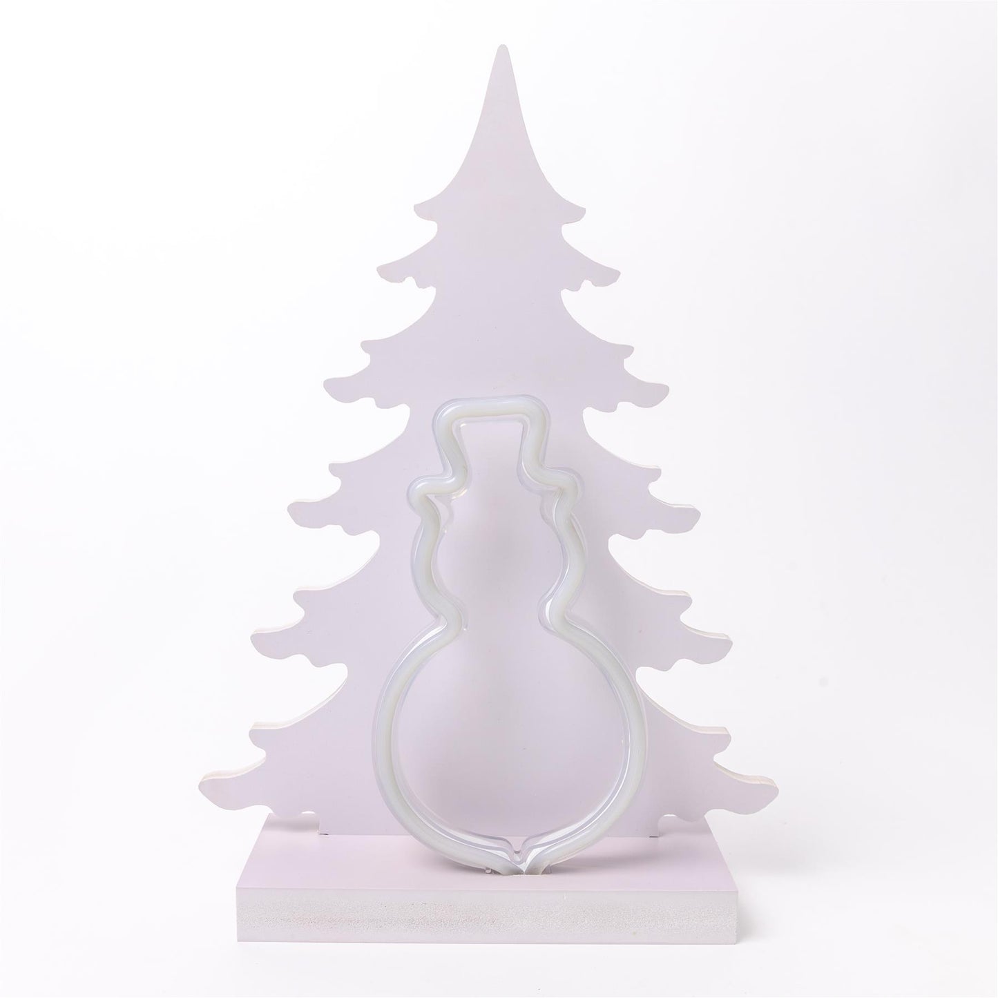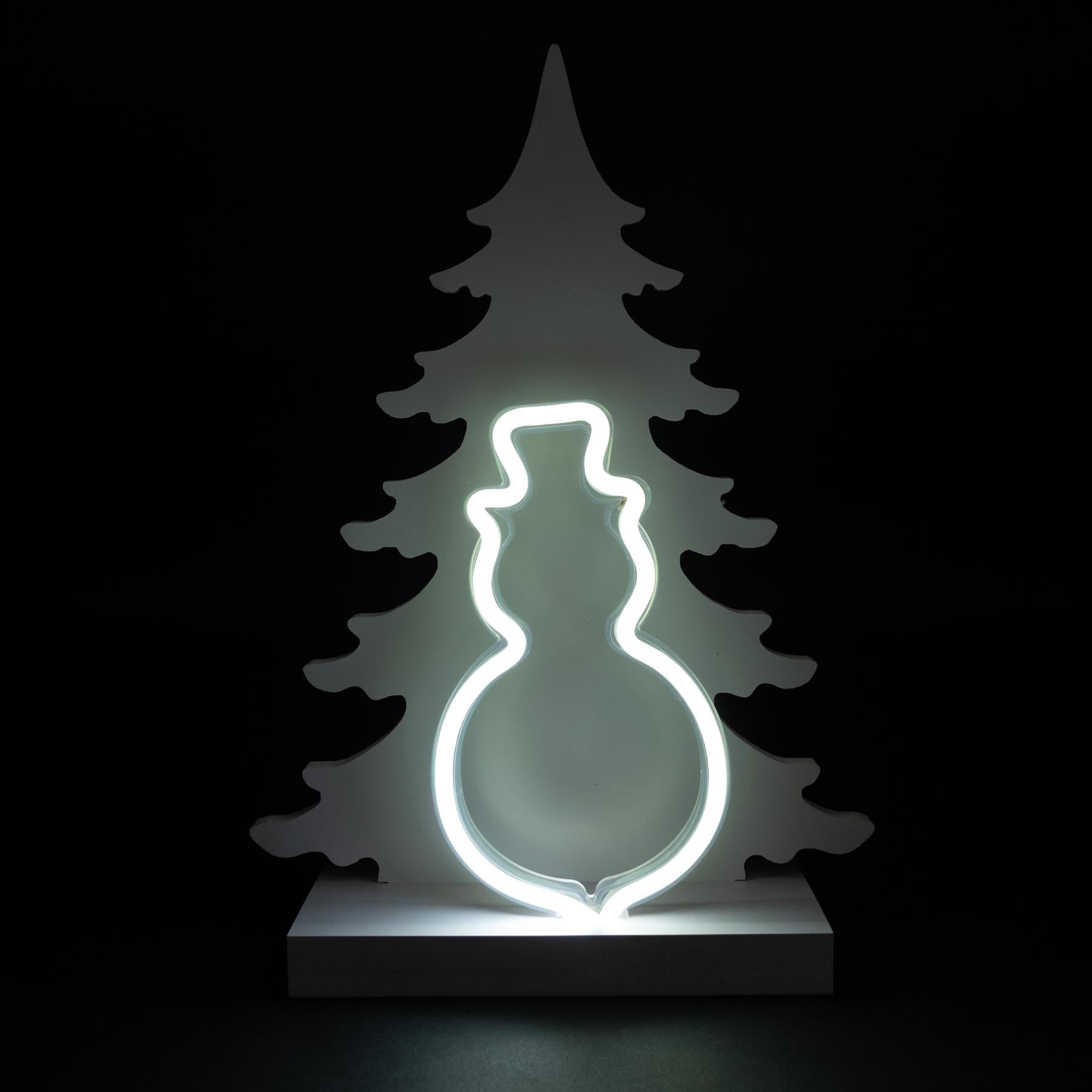 - Battery operated Christmas tree wooden table top featuring snowman silhouette, white wood finish and is detailed with 76 warm white LED lights, which emit a subtle, inviting glow when illuminated.
