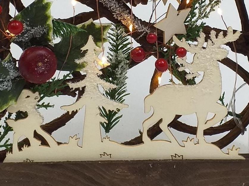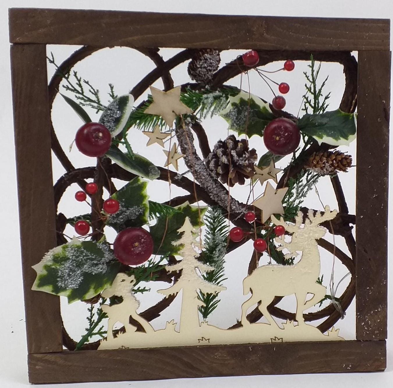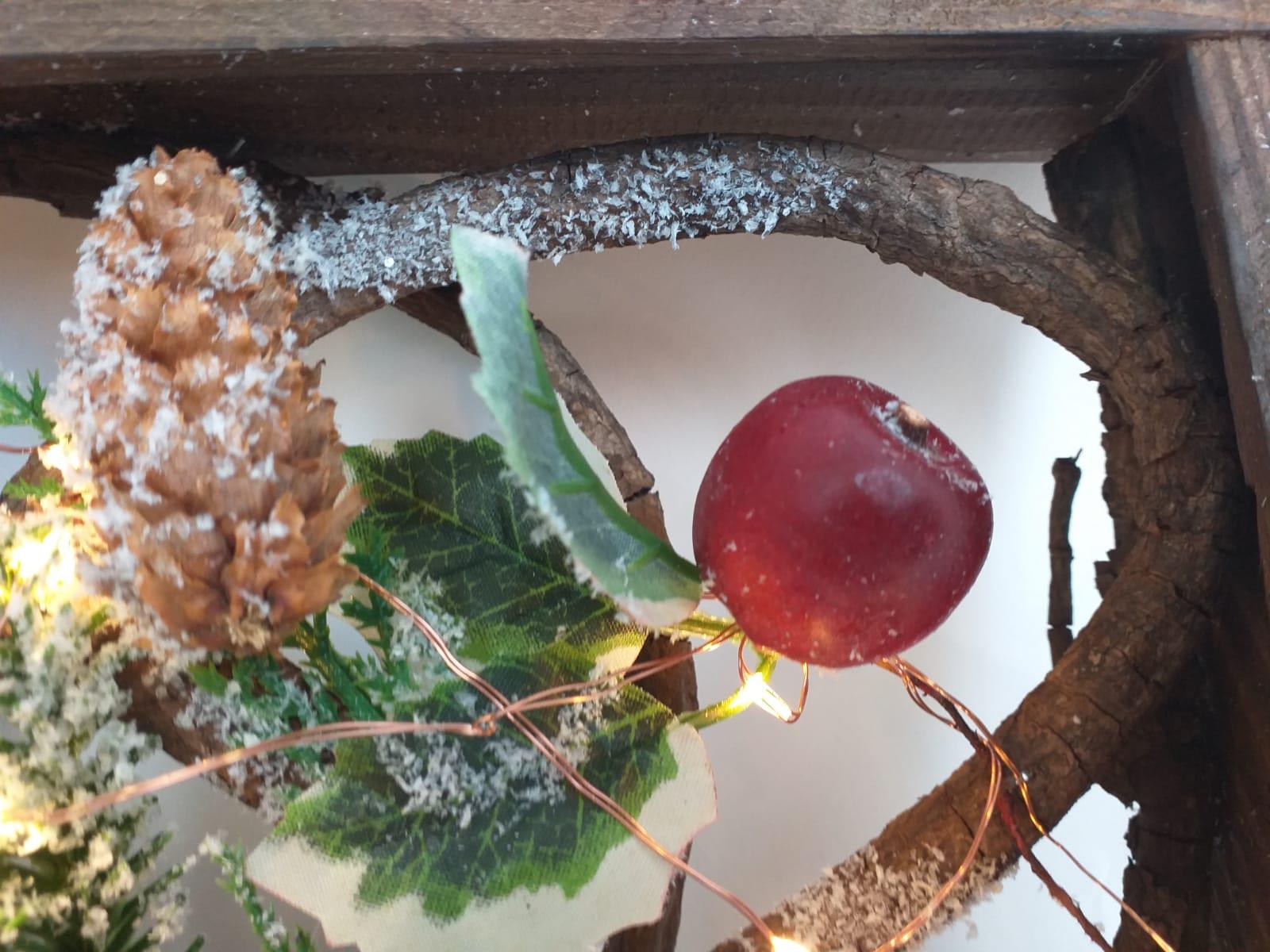 - The frame has been filled with brown wooden sticks, pine cones, red berries, apples, leaves and wooden stars that have been dusted with snow.