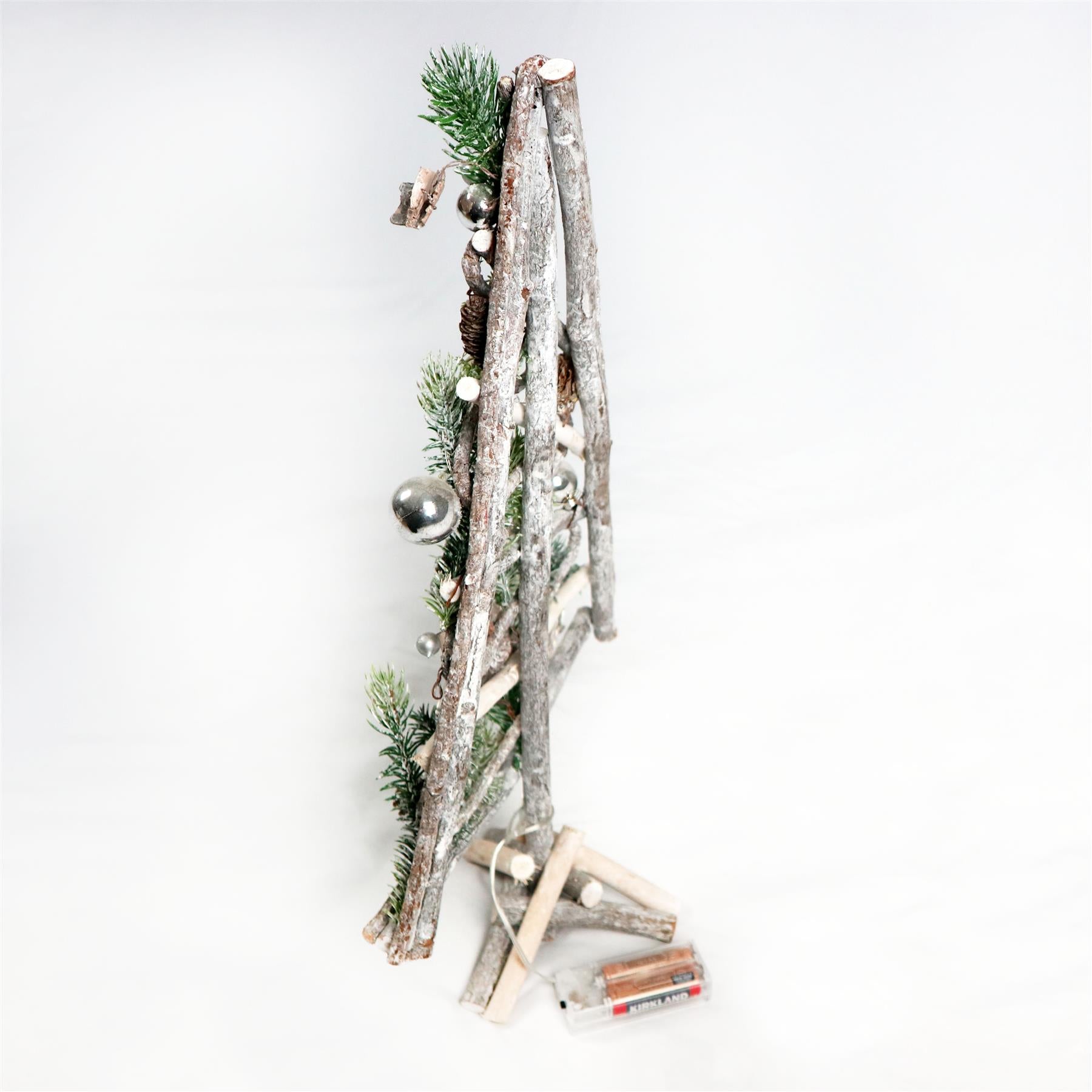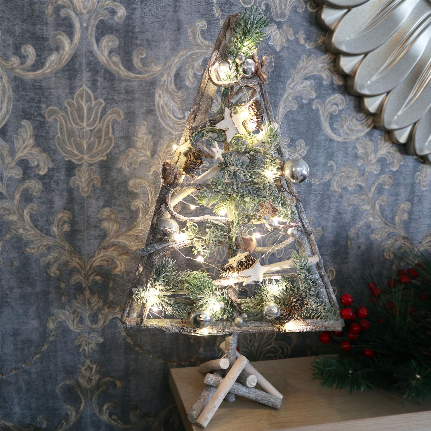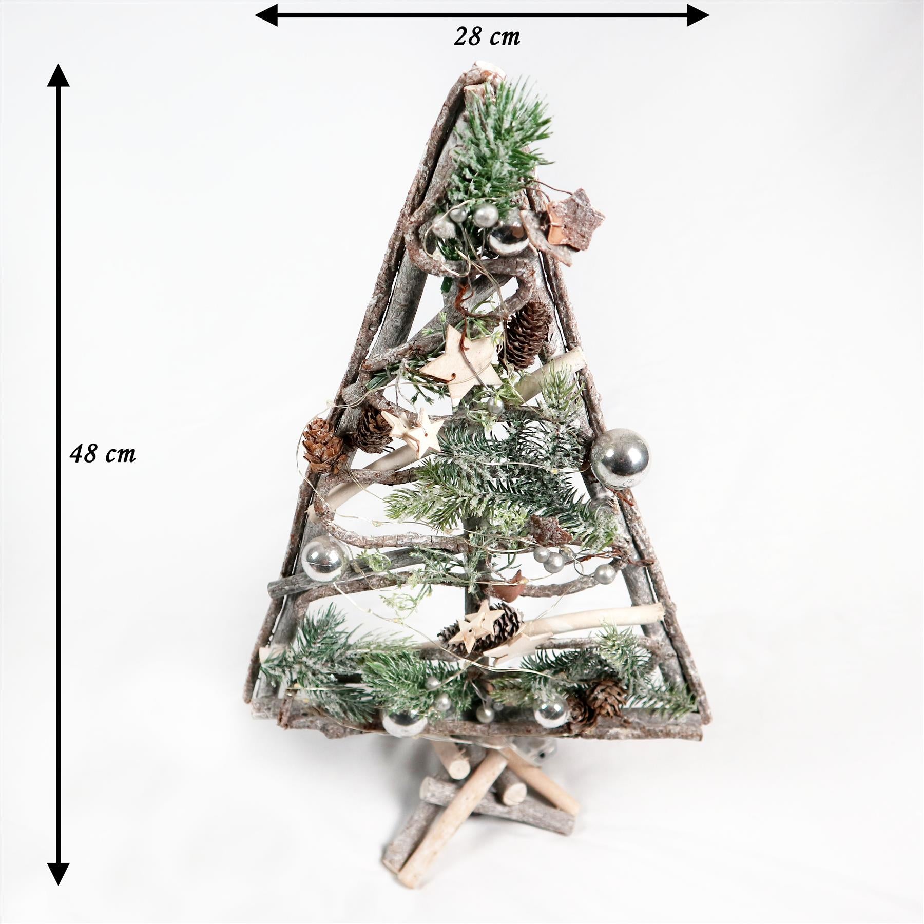 - Chunky free standing brown wooden frame. Filled with wooden sticks, pinecones, silver baubles, wooden stars and leaves that have been dusted with snow.